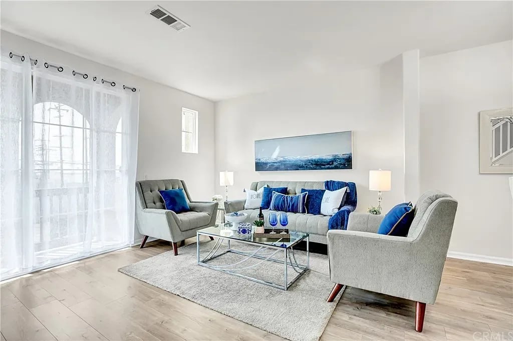 Gorgeous, Contemporary, Newer Townhome Built in 2008 in Gated "Las Ventanas" Community. This Immaculate home has 1380 Sq.Ft of living space and Beautiful Upgrades. Newly Painted. The Main Floor has a Large Open Floorplan with Lots of light, High Ceilings, and Newer Laminate Flooring in the Living Room. The Kitchen is modern with Granite Counters, Breakfast Bar with Pendant Lighting, Cherry Wood Stained Cabinets, and Stainless Steel Appliances. Kitchen is open to the Dining Area and Spacious Living Room which Overlooks the Balcony with Glass Patio Slider. Enjoy a cup of coffee or glass of wine on your balcony. One Bedroom and Full Bathroom is located on the Main living area floor. Two Additional Master Bedroom suites Upstairs both with Ample Closet Space. The Larger of the Two Masters has an attached Bathroom with Dual Sinks and Wood Cabinets. 2nd Master Bathroom upstairs has a Tub/Shower Combination. New Carpet Installed. Hallway has Lots of Linen & Storage space. Central Air/Heat. Ground-level Front door entry to 1st floor with Direct Garage Access to Oversized 2 Car Garage and Laundry. Beautiful grassy community area to walk your dog, picnic, BBQ or just relax. Lots of Guest parking. Minutes to nearby Del Amo Fashion Center & Freeway.
